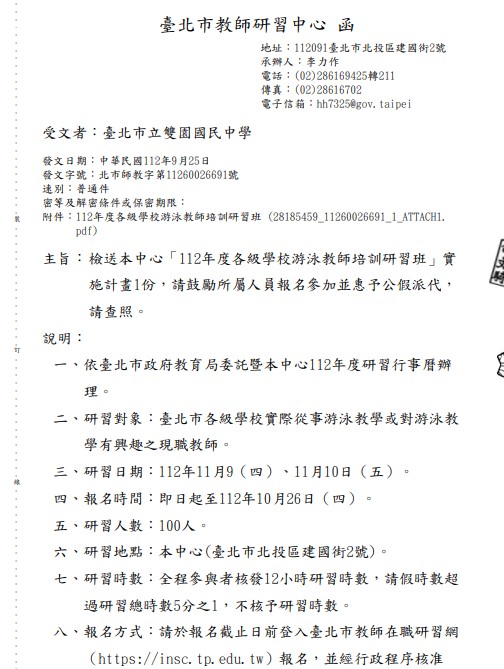 惟本案非為指定調訓性質.目前本校無派員需求.倘有教師有意願參加請在不影響課務及業務下參加.且課務需自理。
