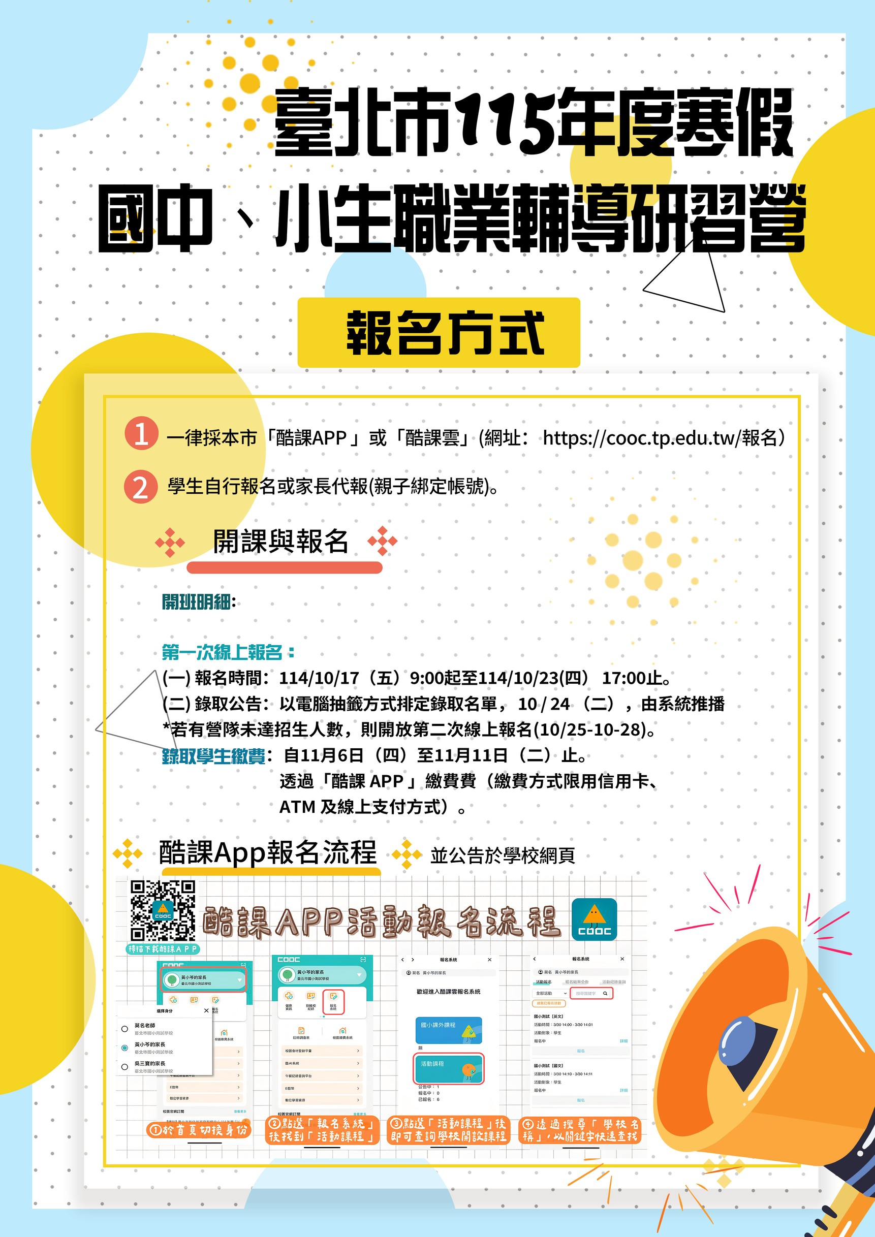 1、本營隊活動一律採本市「酷課APP」或「酷課雲」(網址:https://cooc.tp.edu.tw/)報名,並透過「酷課