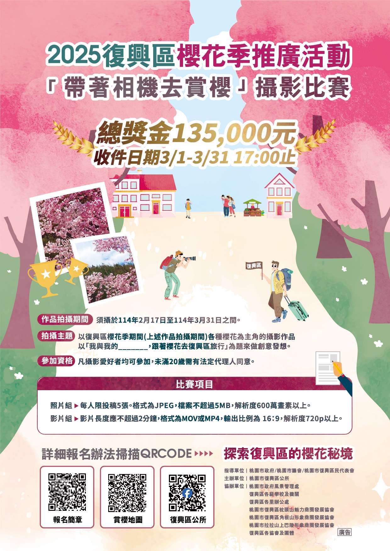 桃園市復興區公所辦理114年「2025復興區櫻花季推廣活動-帶著相機去賞櫻」攝影比賽,詳情請看活動宣傳海報。